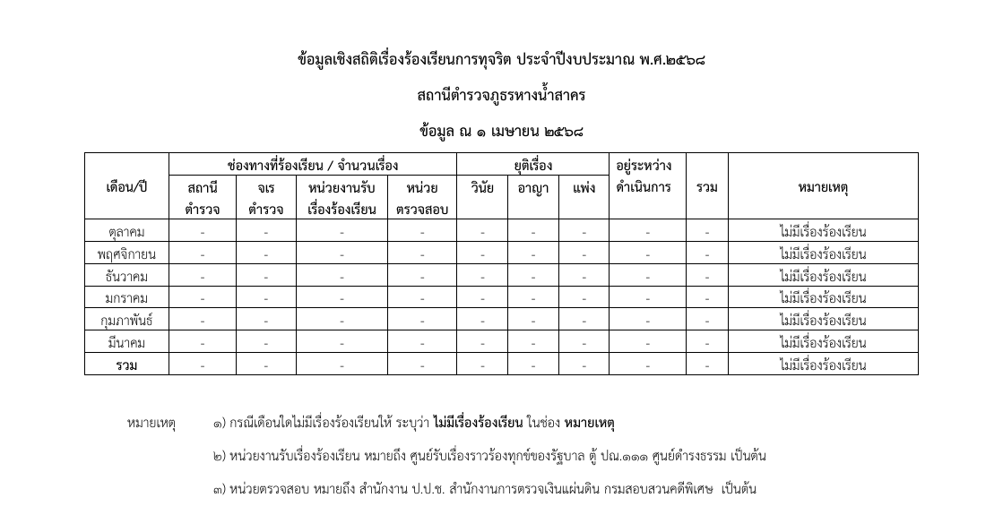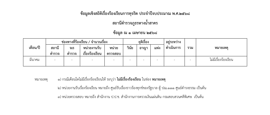ข้อมูลสถิติเรื่องร้องเรียนการทุจริตและประพฤติมิชอบของเจ้าหน้าที่ของ              สถานีตำรวจภูธรหางน้ำสาคร เดือน มีนาคม 2568