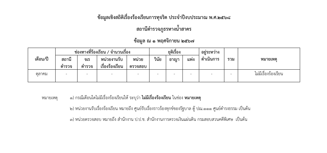 ข้อมูลสถิติเรื่องร้องเรียนการทุจริตและประพฤติมิชอบของเจ้าหน้าที่ของ                  สถานีตำรวจภูธรหางน้ำสาคร เดือน ตุลาคม 2567