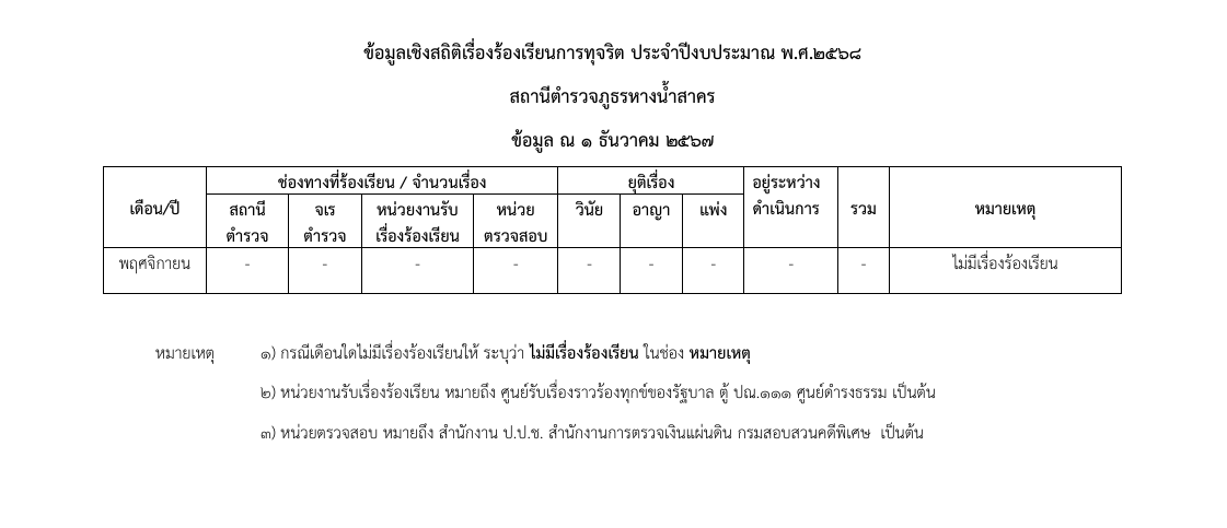 ข้อมูลสถิติเรื่องร้องเรียนการทุจริตและประพฤติมิชอบของเจ้าหน้าที่ของ              สถานีตำรวจภูธรหางน้ำสาคร เดือน พฤศจิกายน 2567