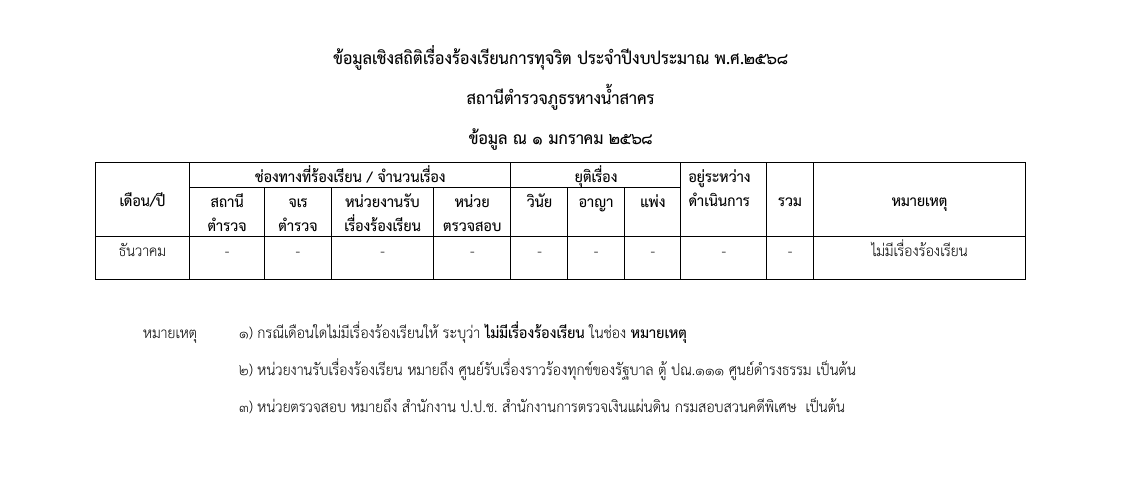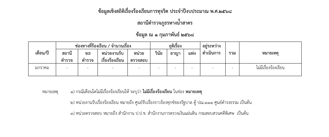 ข้อมูลสถิติเรื่องร้องเรียนการทุจริตและประพฤติมิชอบของเจ้าหน้าที่ของ              สถานีตำรวจภูธรหางน้ำสาคร เดือน มกราคม 2568