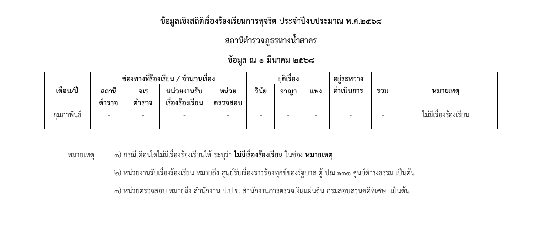 ข้อมูลสถิติเรื่องร้องเรียนการทุจริตและประพฤติมิชอบของเจ้าหน้าที่ของ              สถานีตำรวจภูธรหางน้ำสาคร เดือน กุมภาพันธ์ 2568